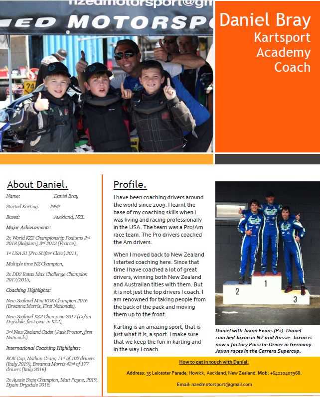 I have been karting for 17 years, during this time I have coached and raced both in New Zealand and overseas.