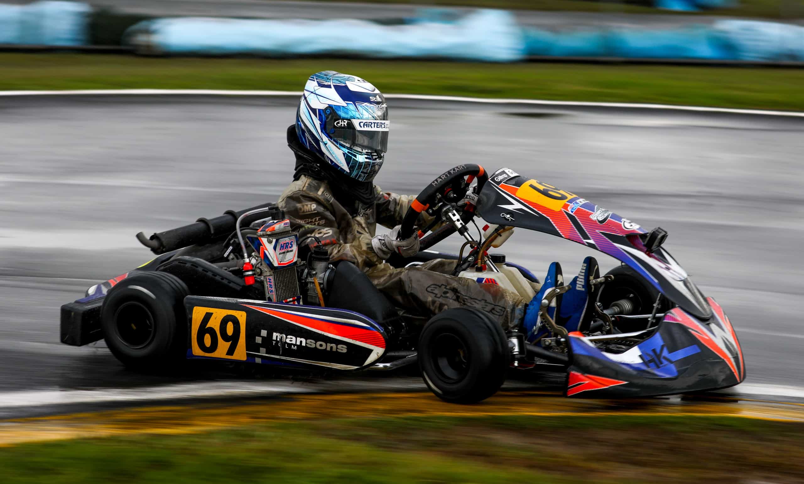 The changeable weather from light rain to lukewarm sunshine produced a drying line as karters flipped a coin to risk potential slowing times with wet tyres, or skating on ice with slicks on slippery surfaces in the wet.