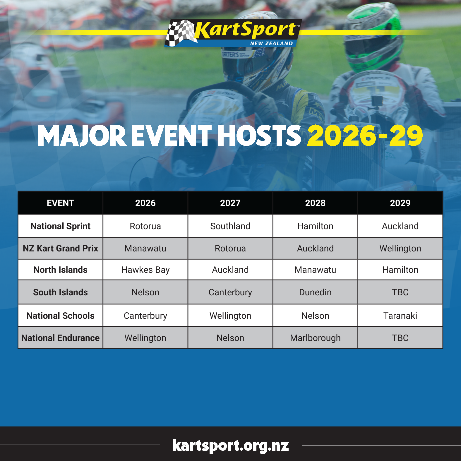 For the first time, KartSport New Zealand is able to announce the host venues for the next four years of major championship karting events.